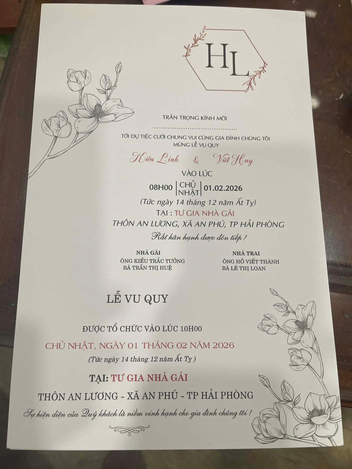 Sự hiện diện của quý khách là niềm vui vẻ và niềm vinh hạnh cho hai vợ chồng tôi. Chân thành cảm ơn! Trang phục : TRẮNG - ĐEN - NÂU ( mong quý khách mặc đúng trang phục để chụp hình cùng dâu rể cho đẹp nha )